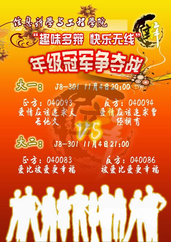 10月28号晚7:00,大一的两场辩论赛复赛同时在教7 201和教7 202打响,由于本轮辩论赛的主题是:“男人与女人”,040096班和040093班,040092班和040094班分别就“男人还是女人更需要关怀”,“现代社会男人还是女人更累”这两个与当今男女双方紧密相关的话题展开了激烈的辩论,双方你来我往,唇枪舌剑,最终还是040093班和040094班技高一筹,胜利会师决赛。