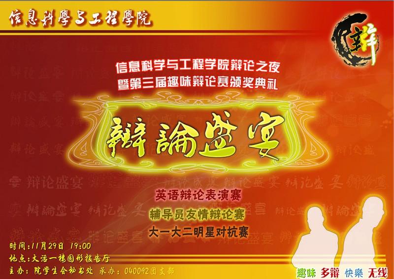 晚会届时将有040091班与042097班之间的英语辩论表演赛以及秘书处同学为大家带来的辩论小品等精彩节目为大家奉献!此外,08、09级辅导员老师也亲自上阵,与同学们PK,究竟孙悟空/猪八戒谁才是更优秀的学生!大一大二辩论明星对抗赛也将围绕“在东大,男生还是女生更苦”的趣味话题展开激烈的辩论!