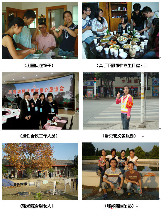 除了认真完成工作,我们这群充满朝气蓬勃热情泛滥的年轻人也没落下丰富课余生活的机会。初到异地,大家免不了经常聚在一起,嘘寒问暖,互安慰鼓励,偶尔也能听到遭遇小偷和抓老鼠的故事。我们东大五个志愿者和上海财经大学的三名志愿者结拜为“共青八怪”,亲得就像一家人。多年来终于可以尝试自己做饭了,我们兴趣盎然地专研厨艺,改善生活;国庆节我们聚在一起,一边观看阅兵式,一边包饺子庆祝;小顾生日,四川“大厨”亲自烧了一桌菜为其庆祝;作为志愿工作者为地方团委服务,我们很荣幸地出席了由团中央第一书记陆昊主持的“共青城投资考察推介恳谈会”;假日灿烂的阳光里,我们一同骑车出游,领略鄱阳湖的绮丽风光;国际志愿者日这天,我们一起去敬老院看望老人;听在共青城奋斗了一辈子的上海知青垦荒队副队长陈家楼老先生,为我们讲诉这片热土上前辈志愿者们的故事……