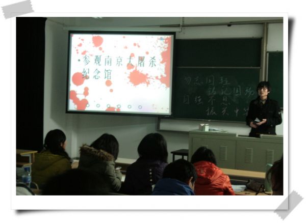 12月13日是“南京大屠杀”事件七十二周年纪念日,一个民族从兴盛到衰落再到复兴,这是一段令每个国人都刻骨铭心的历史。作为优秀的东大学子,我们更应铭记。铭记,不是为了仇恨,铭记,只是为了防止悲剧的再次上演。处于大三年级的我们正在人生的又一个关键时期,很多人对自己的未来很茫然,为了让大家树立坚定地学习决心,摆脱目前迷茫的现状,重新找到奋斗目标,我042077团支部组织了“勿忘国耻 铭记国殇 奋发自强”系列爱国主义教育活动。通过此次活动,希望大家能够铭记历史教训,树立正确的学习观,坚定学习信念,激发学习与科研热情,真正做到为中华之崛起而读书。