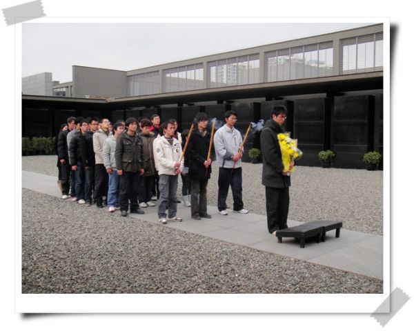 2009年12月16日,我支部全体成员前往侵华日军南京大屠杀遇难同胞纪念馆学习参观。下了校车后,大家都自觉保持一致地静默与肃穆,深深的感怀72年前这块土地上那沉重的历史痕迹。首先,我们参观了史料陈设馆。进入展厅,我们看到了大屠杀期间一些珍贵的历史文物,有被杀害的中国人民的骸骨,有一些已经锈迹斑斑的凶器:短刀、刺刀、甚至铁钉,这些都是日本侵略者对中国人民犯下不可饶恕罪过的铁一般的证据。当我们看到70年前成千上万的中国人被惨不忍睹地埋葬的“万人坑”时,我们的心情更加沉重了。让我们牢记那段屈辱的历史和抗战胜利的历史!馆内的一个12秒装置:两整面墙的人像照片,随着12秒的时间流逝,依序点亮,再依序熄灭。12秒一个生命消亡,30万的生命在短短几周的时间以这样的速度逝去,这给生人是怎样的悲恸。接着我支部全体成员组织了默哀仪式,并为死者献上鲜花。走出史料馆,伴随着悲伤的音乐,我们来到了一片水池前,对面一个很大的塑像:一个女人抱着一个小孩手里放着和平鸽,柱子上写着两个大字,和平.此时,大家不约而同地停留下来为死者祈福,默哀。