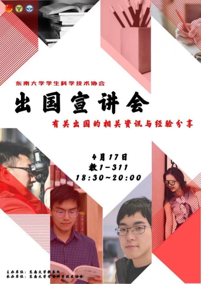 为增进同学们对出国深造的了解,出国留学经验交流分享会将于4月17日(周三)晚18:30~20:00于J1-311举办。届时将有优秀学长学姐为大家介绍出国读研(美国、欧洲)、出国实习、出国交流等相关经验,就如何申请学校、交流经历、国外课程设置、国外学习生活特点等同学们迫切想要了解的问题进行介绍。望有出国意愿的同学们积极参加!