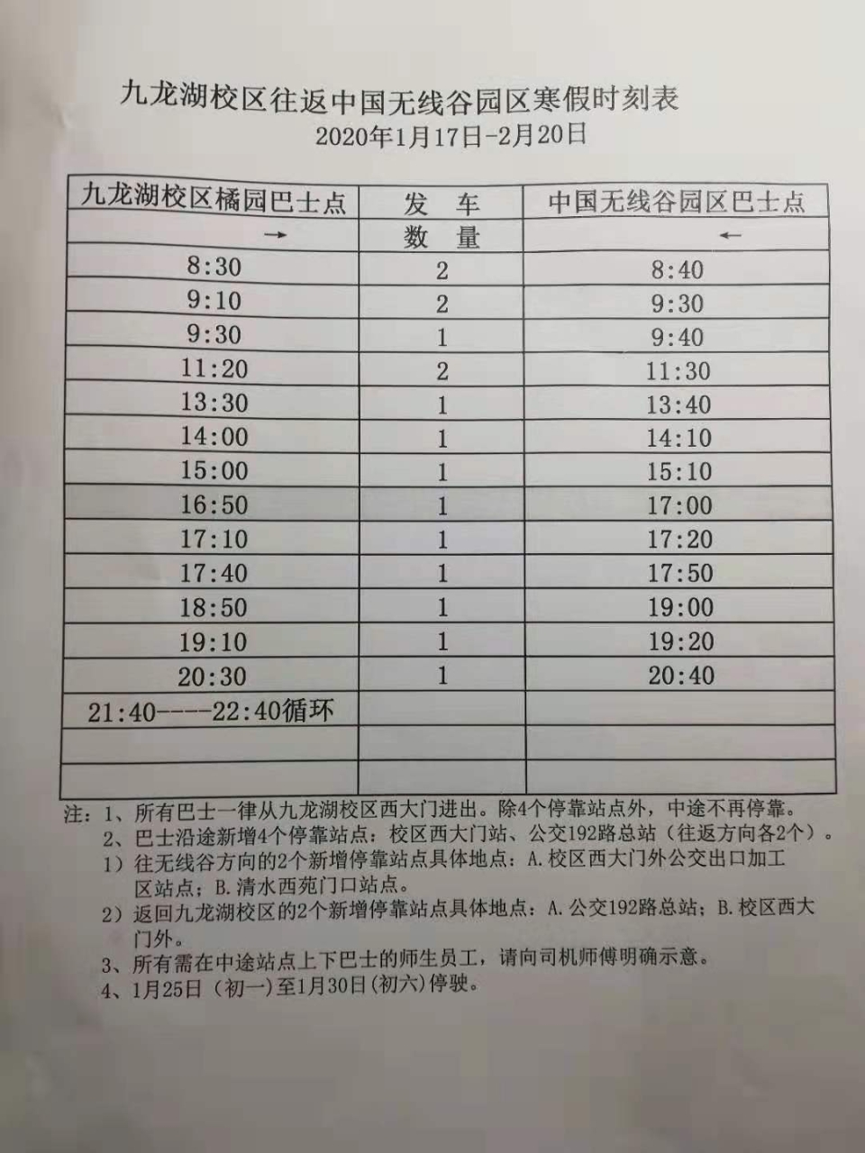 2020年寒假无线谷园区巴士班车表(01.17-02.20)