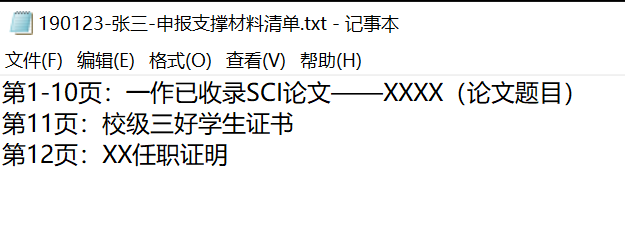 (3)将申报支撑材料梳理成一个txt文件,对pdf格式的支撑材料分页数列举对应成果,例如:第1-10页:一作已收录SCI论文——论文题目,文件命名为:学号-姓名-申报支撑材料清单;