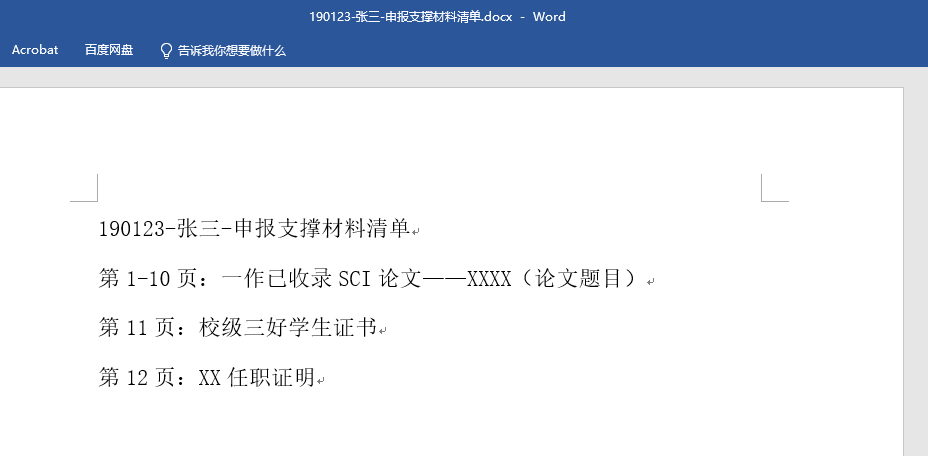 (3)将申报支撑材料整理成一页word文件(宋体,四号),对支撑材料分页数列举对应成果,例如:第1-10页:一作已收录SCI论文——论文题目,首行标题为:学号-姓名-申报支撑材料清单(如申请破格请标注),并附在支撑材料首页;