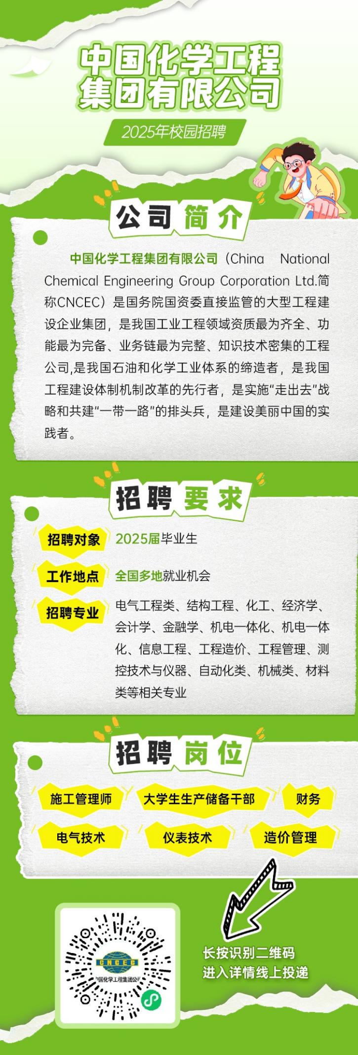 中国化学工程集团有限公司(China National Chemical Engineering Group Corporation Ltd.简称CNCEC)是国务院国资委直接监管的大型工程建设企业集团,是我国工业工程领域资质最为齐全、功能最为完备、业务链最为完整、知识技术密集的工程公司,是我国石油和化学工业体系的缔造者,是我国工程建设体制机制改革的先行者,是实施“走出去”战略和共建“一带一路”的排头兵,是建设美丽中国的实践者。