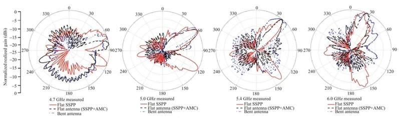 图5 对比了SSPP结构和平坦状态下的天线,以及波状弯曲状态下的天线在一些典型频率(如4.7 GHz、5.0 GHz、5.4 GHz和6.0 GHz)下的归一化实测辐射模式