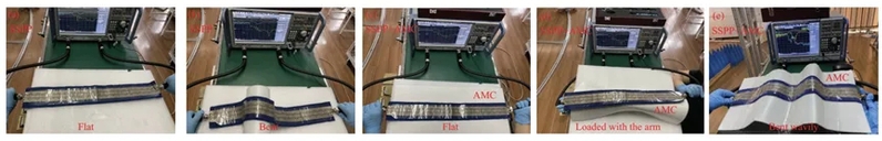 为了验证所提出的设计,采用激光切割技术将Nomex III-A织物基板(介电常数2.605, 损耗正切角0.027, 厚度为0.5 mm)和导电织物(表面电阻为0.05 欧姆/平方)加工成预设图案。然后,使用切割-转移方法对原型进行处理。为了验证所提出的SSPP结构和天线在不同状态下S参数的鲁棒性,图3展示了测量SSPP结构和天线S参数的实验装置照片。