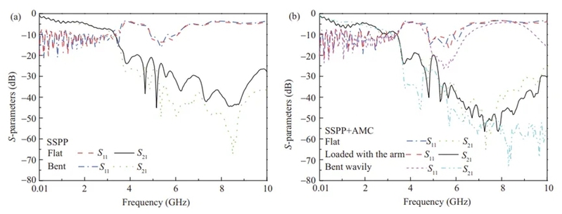 图4 S-参数实测结果:(a) 所提出的SSPP结构在平坦状态和弯曲状态下的表现;(b) 天线在平坦状态、加载手臂状态以及波状弯曲状态下的表现
