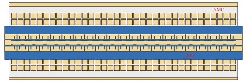 与传统的刚性或具有共型曲面能力的FBSA不同,本文提出的天线采用芳纶3A(Nomex III-A)作为基板,并结合导电织物作为辐射体,提供了一种低剖面且舒适的可穿戴技术解决方案。相比传统通过基模快波模式实现频率波束前向辐射扫描的方法,本文基于高次谐波模式的周期性人工表面等离子体激元(SSPP)技术,实现了从后向到前向的辐射,显著扩展了辐射方向的覆盖范围。为减少天线对人体的辐射并保障穿戴者安全,本文设计了一个位于SSPP结构下方的人工磁导体(AMC)平面。