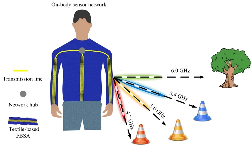 针对上述问题,本文提出并设计了一种抗变形的织物基FBSA,用于测量目标角度,并通过调节频率实现向特定目标的无线信号传输。图1展示了所提方案的概念示意图。